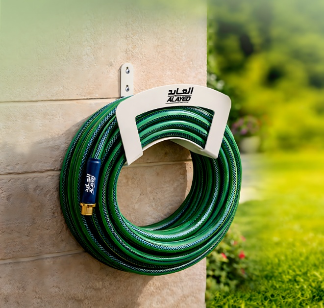 حامل لي جداري ذات مظهر جمالي ويحافظ على الخرطوم من العقد والتلف ويساعد على سهولة التخزين ويتميز بمرونة الإستخدام