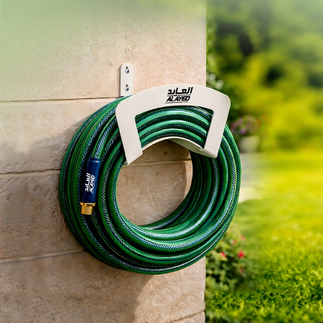 حامل لي جداري ذات مظهر جمالي ويحافظ على الخرطوم من العقد والتلف ويساعد على سهولة التخزين ويتميز بمرونة الإستخدام