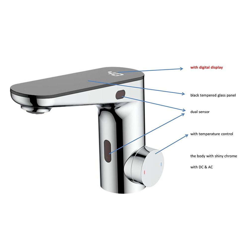 حساس امامي 30 سم حساس جانبي 8 سم حار بارد شاشة ديجتال للحرارة يعمل بالبطارية او بالتيار الكهربائي مسارات خاصة بالماء عبر انابيب مطاطية دون ان تلامس المعدن شكل انيق المنتج حاصل على شهادات الجودة CE وSASO