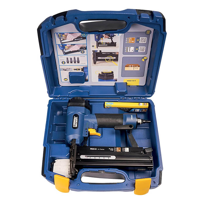 يتم توفيرها في علبة تخزين ونقل واقية مفيدة تتضمن دليل البدء السريع الذي يساعدك على استخدام الأداة بشكل صحيح والعثور على الدباسة والمسمار المناسبين عند الحاجة إلى إعادة التعبئة.