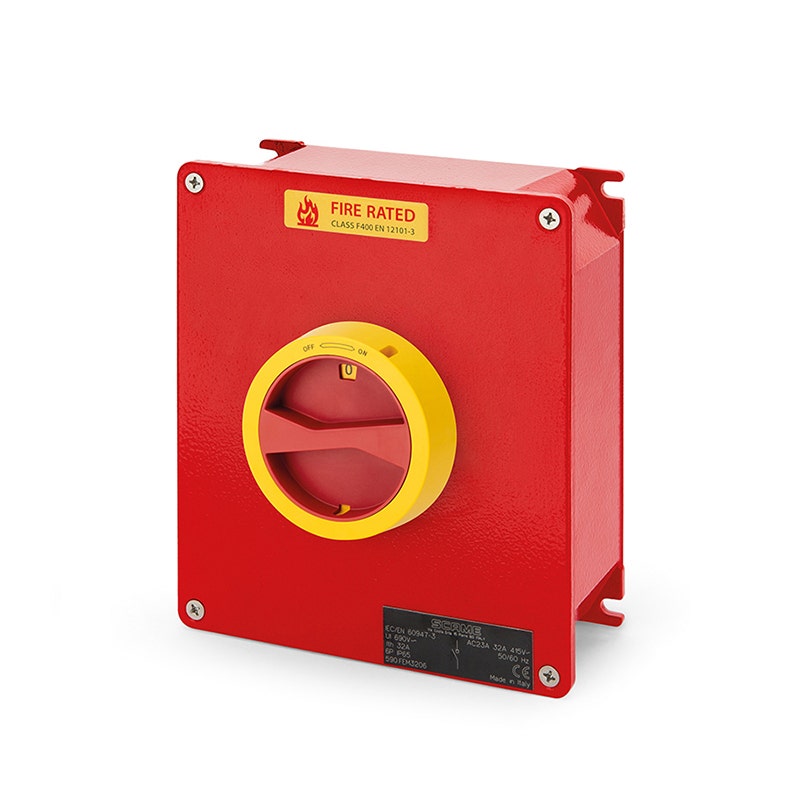 سكامي – مفتاح فصل مغلق (AC22A/AC23A)، 32A، 3P + N، IP65، 168x192x80mm، FR1 IK10، طوارئ أصفر/أحمر، مقاوم للحريق، 1xNA+1xNC