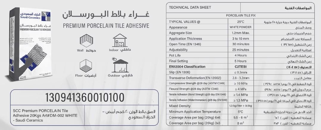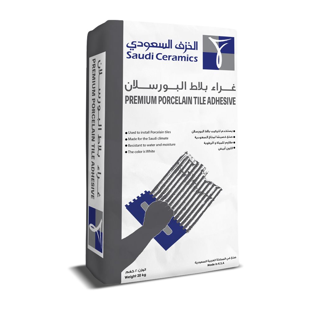 يستخدم لتركيب بلاط البورسلان (الداخلي والخارجي (الجدران والأرضيات) صنع خصيصًا لمناخ السعودية مقاوم للمياه والرطوبة اللون: أبيض 20 كجم