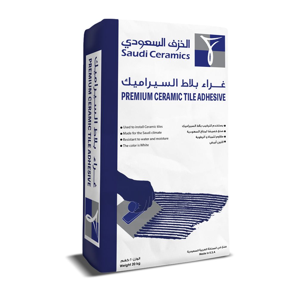 يستخدم لتركيب بلاط السيراميك ( الداخلي، والخارجي (جدران وأرضيات) صنع خصيصًا لمناخ السعودية مقاوم للمياه والرطوبة 20 كجم