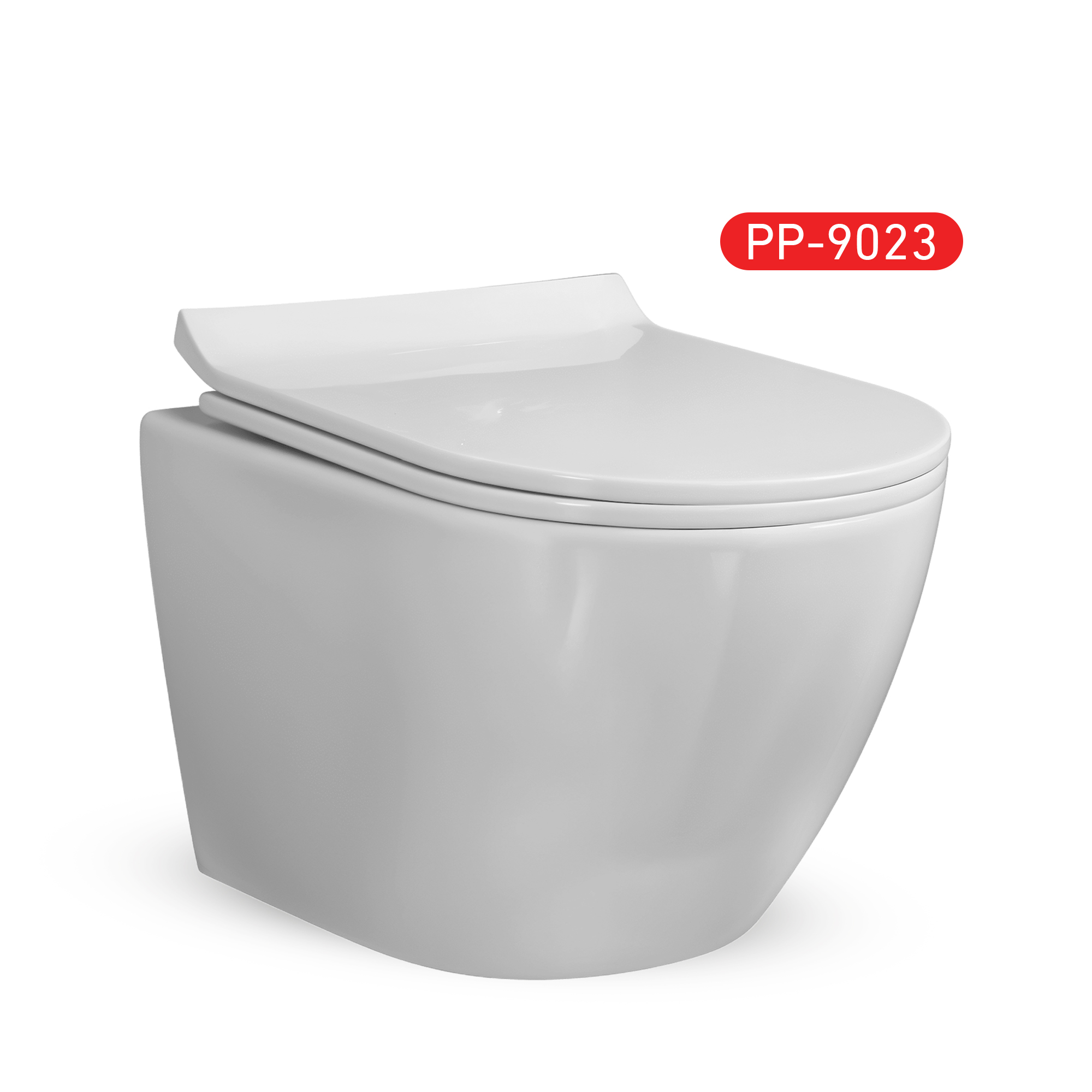 مرحاض جداري مُعلّق تكنو موديل PP23 بتصميم عصري وسطح سهل التنظيف، مناسب للحمامات الحديثة ويُركّب مع سيفون/طرد مخفي. الأبعاد: 49×36×34 سم.