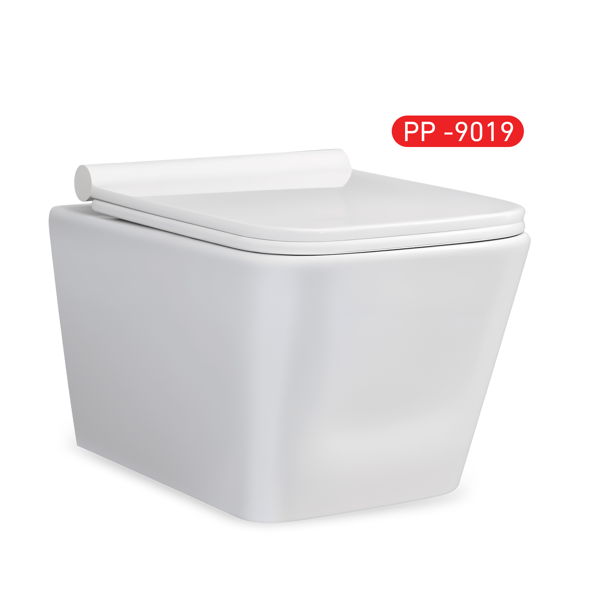 مرحاض جداري مُعلّق تكنو موديل PP19بتصميم عصري وسطح سهل التنظيف، مناسب للحمامات الحديثة ويُركّب مع سيفون/طرد مخفي. الأبعاد: 51.5×36×34 سم.