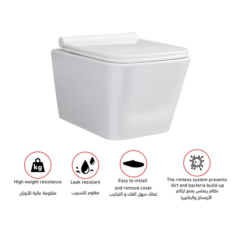 ارتقِ بتصميم حمامك مع مرحاض تكنو الجداري المُعلّق الذي يجمع بين الأناقة والعملية. يأتي بتصميم عصري وانسيابي يمنح المكان مظهراً مرتباً ومساحة أوسع، مع سطح أملس يساعد على سهولة التنظيف والمحافظة على النظافة اليومية. يعتمد على تركيب صندوق طرد مخفي ليحافظ على الشكل الجمالي ويقلّل تجمع الأوساخ حول منطقة التثبيت، مما يجعل الحمام أكثر ترتيباً ولمسة نهائية أكثر فخامة.