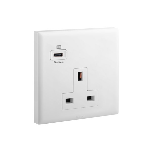 ليجراند – مقبس إلوي، بريطاني، مفرد، Unswitched + USB-A، 13A، 250V، أبيض