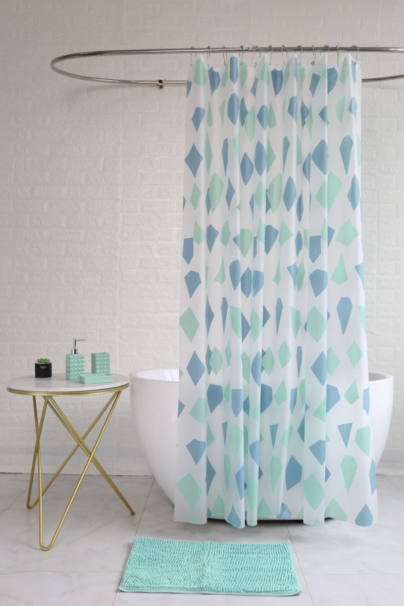 مجموعة من 5 قطع: ستارة حمام، سجادة أرضية، 3 قطع اكسسوار حمام (صابونية، حامل صابون، كوب)