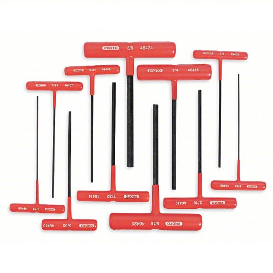 تحتوي مجموعات المفاتيح السداسية على شكل حرف T على ذراع واحد طويل مع طرف تثبيت في النهاية ، وذراعان قصيران يشكلان مقبض يوفر عزم دوران أكبر من مفتاح على شكل حرف L.