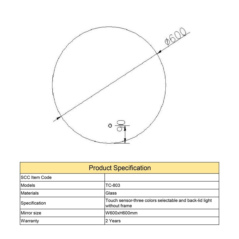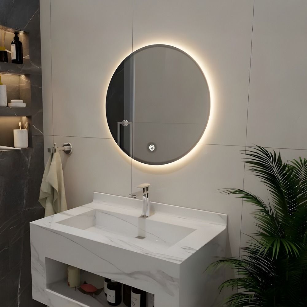 مرآة حمام دائرية – (TC-803) المقاس: 60×60 سم السماكة: 0.4 سم مرآة مع إضاءة ليد خلفية (3ألوان)، حساسات تعمل باللمس، بدون إطار مرآة حمام دائرية – (TC-803)