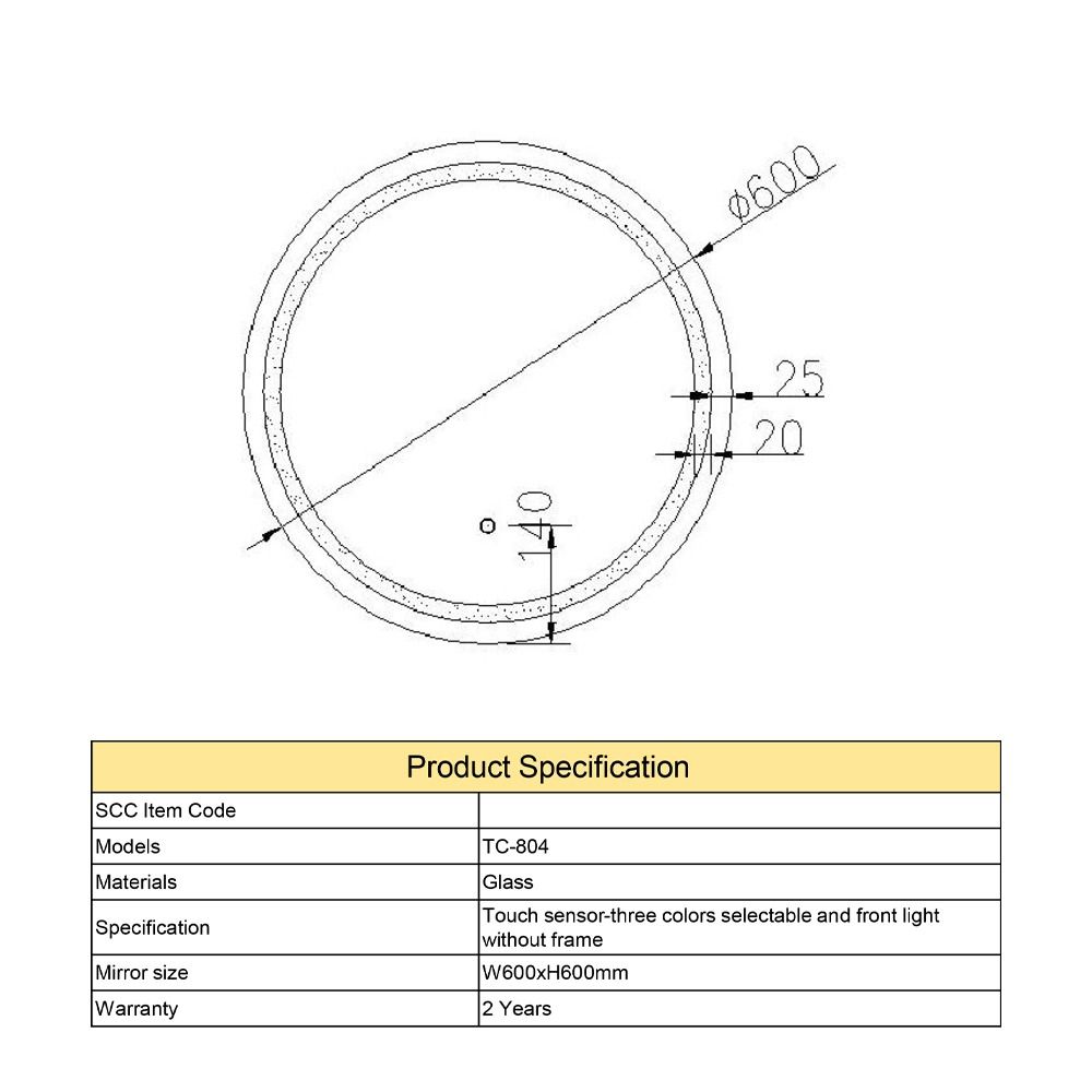 مرآة حمام دائرية – (TC-804) المقاس: 60×60 سم السماكة: 0.4 سم مرآة مع إضاءة ليد أمامية (3ألوان)، حساس يعمل باللمس، بدون إطار ضمان سنتين