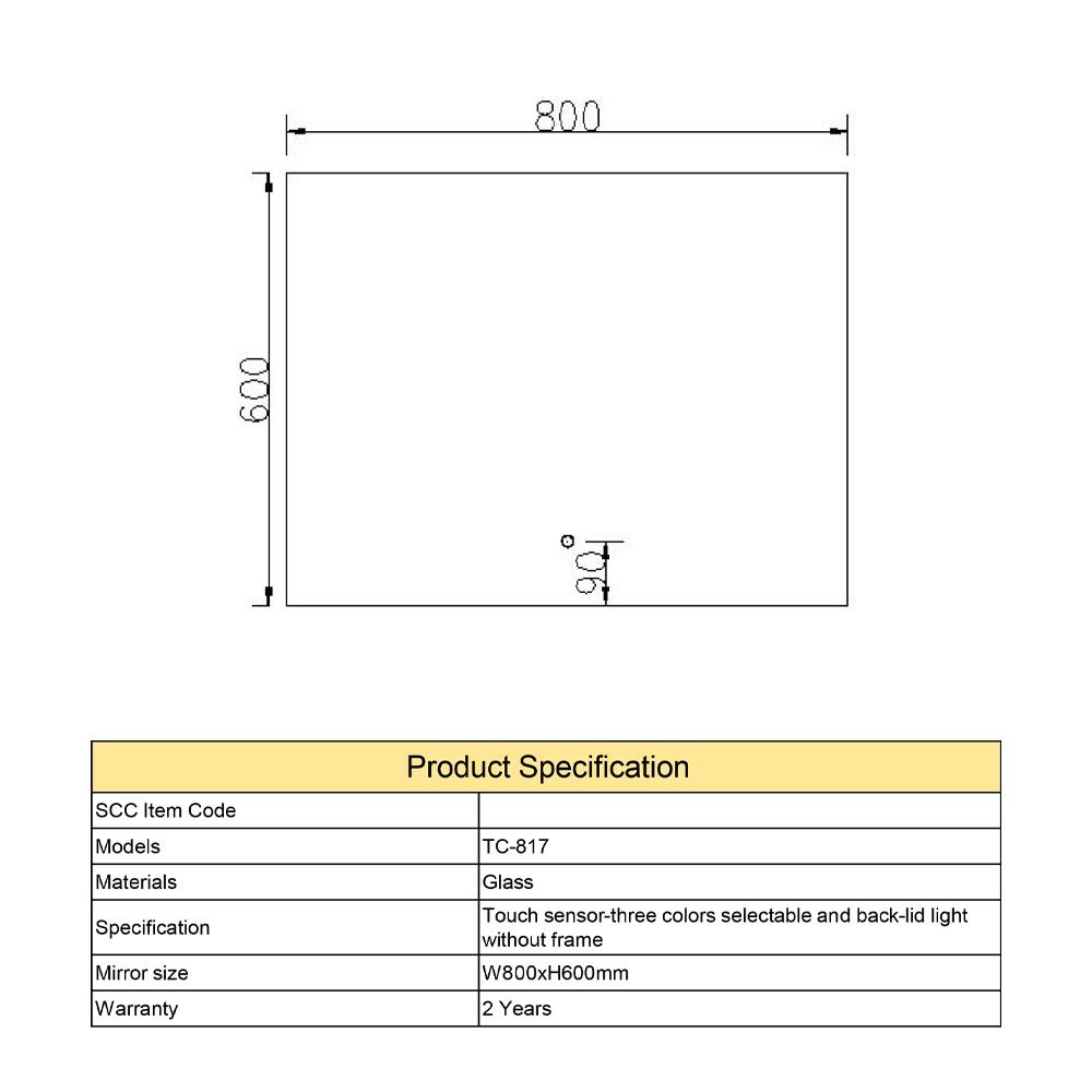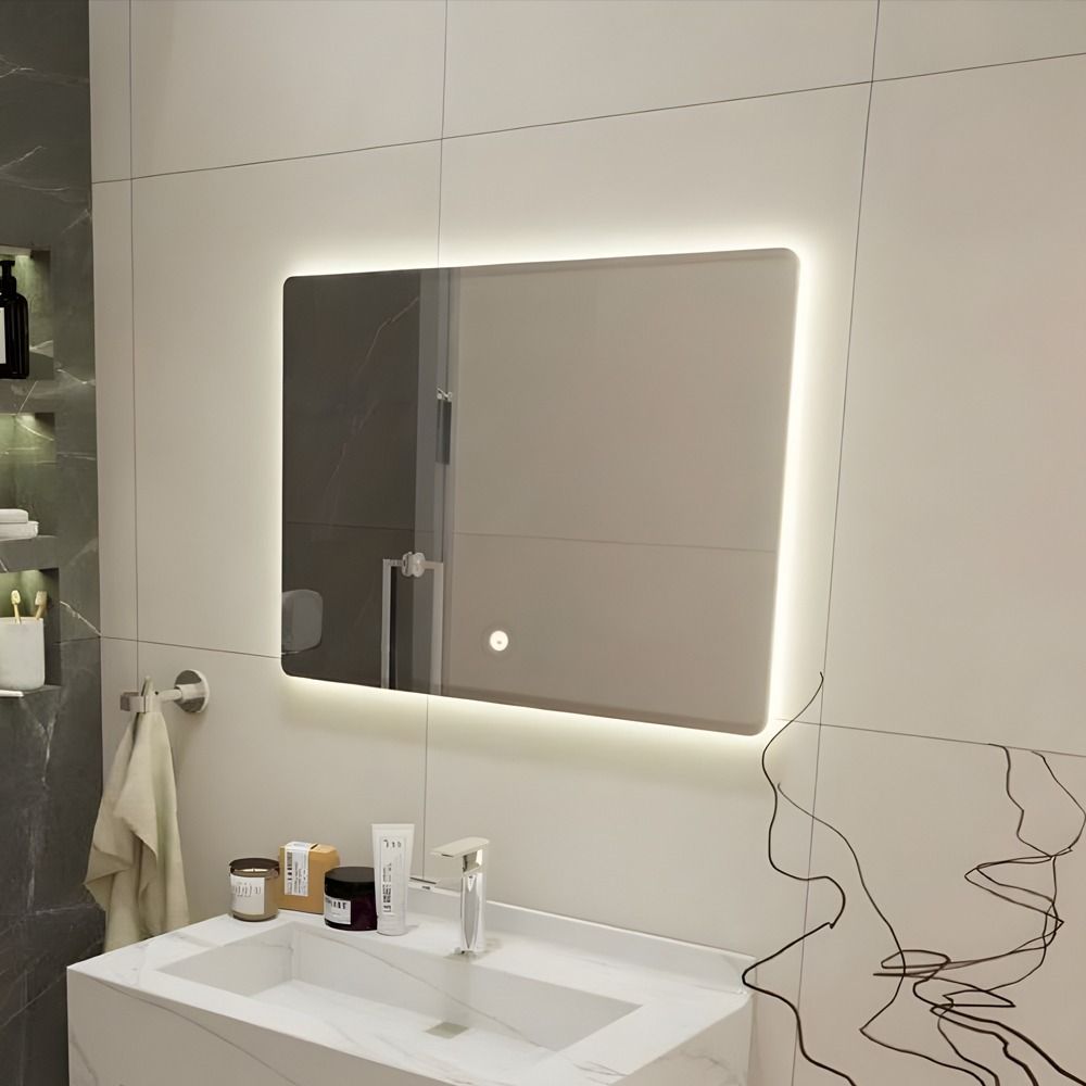 مرآة حمام مستطيلة – (TC-817) المقاس: 80×60 سم السماكة: 0.4 سم مرآة مع إضاءة ليد خلفية (3ألوان)، حساسات تعمل باللمس، بدون إطار ضمان سنتين