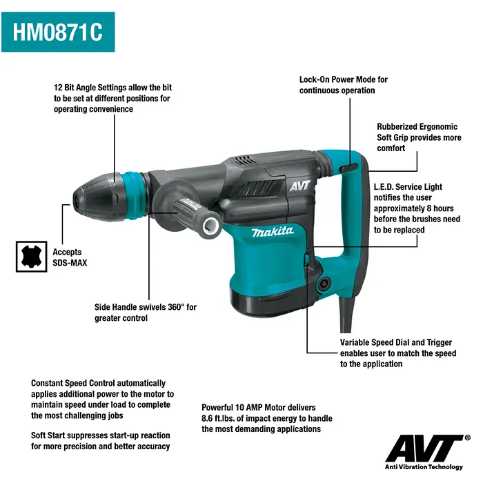 مطرقة هدم و تقشير ماكيتا HM0871C تعمل بمحرك بقوة 1100 واط يوفر 1100 ~ 2650 ضربة في الدقيقة. تتميز بمقبض خلفي يمتص الاهتزاز لتقليل الاهتزازات على المستخدم. كما أن مطرقة الهدم و التقشير تحتوي على خاصية “عدم التحميل السلس” حيث أنها ميزة ممتازة تعمل تلقائيًا على تقليل سرعة المحرك عند عدم الاستخدام، وبالتالي تزيد من عمر الأداة ومن أدائها. إضافة إلى ذلك، تحتوي على تقنية مقاومة الاهتزاز وهي نظام موازنة داخلي يقلل الاهتزاز بشكل كبير مع تقنية تقليل الاهتزاز بنسبة 70%، وخاصية العزل المزدوج التي توفر الحماية للمستخدم. وخاصية السرعة المتغيرة التي تتيح للمستخدم التحكم في السرعة، وخاصية التحكم في السرعة الثابتة للحفاظ على السرعة تحت الحمل. خاصية التشغيل السلس لضمان بداية تشغيل أكثر سلاسة ونعومة، وأخيراً خاصية تجميع الغبار لتقليل كمية الغبار الناتج أثناء القطع.
