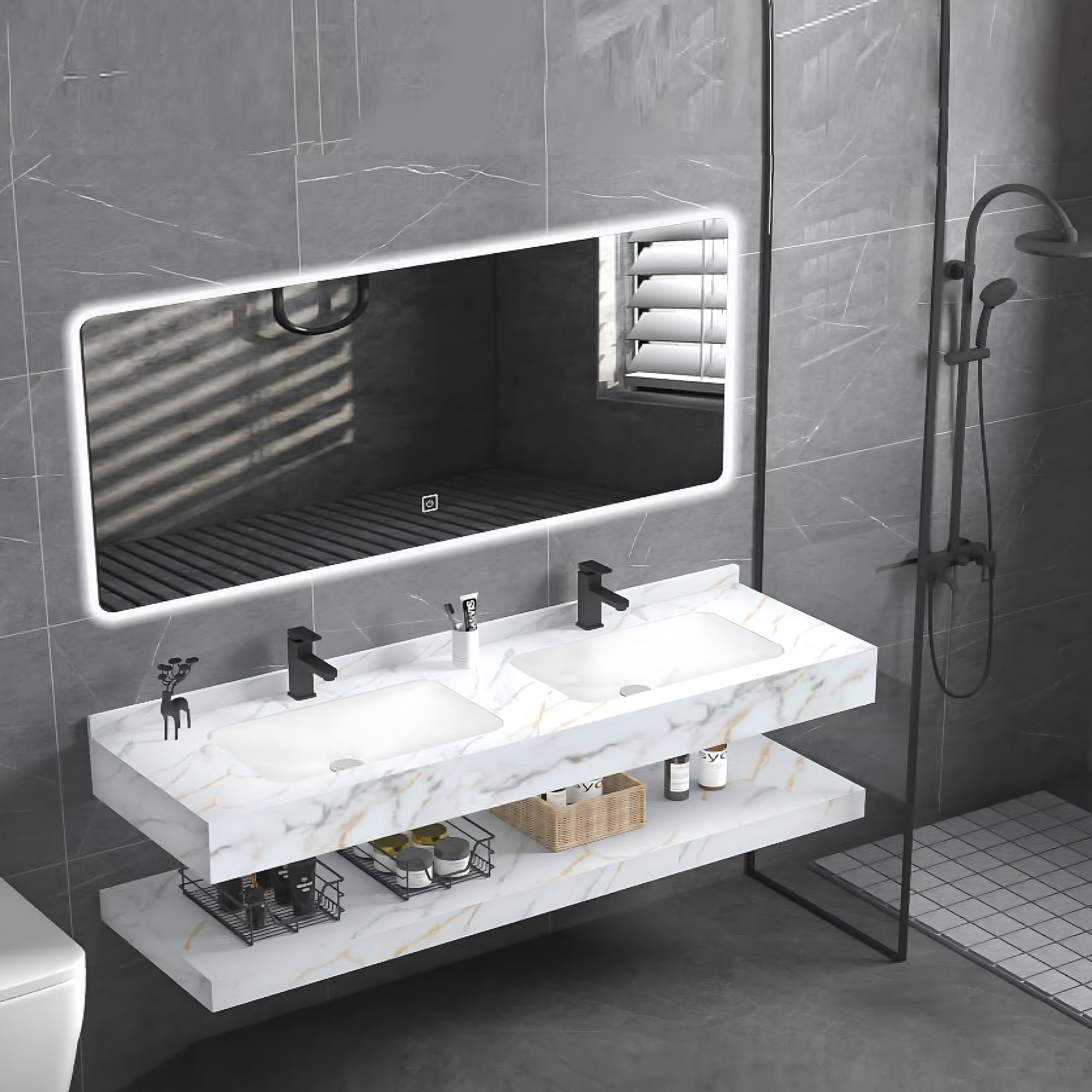 مغسلة رخام معلّقة بتصميم عصري مع رف سفلي عملي، تمنح حمامك أناقة ومساحة تخزين إضافية.