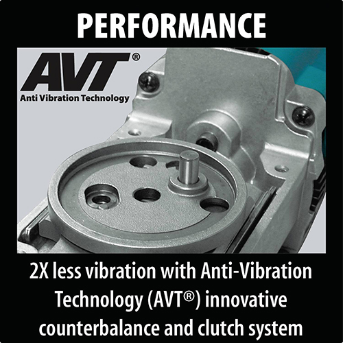 تقنية مقاومة الاهتزاز: تقنية مقاومة الاهتزاز هي نظام موازنة داخلي يقلل بشكل كبير من الاهتزاز بنسبة 70 ٪ ، ونحن نعلم من التجربة أنه كلما كانت أداة الطاقة أكبر ، كلما كان من الصعب التحكم فيها أثناء العمل. الآن ، بفضل نظام AVT من ماكيتا ، أصبح العمل بمطرقة أو مطرقة هدم أسهل بكثير ولا يتطلب مثل هذه اليد القوية من المستخدم.