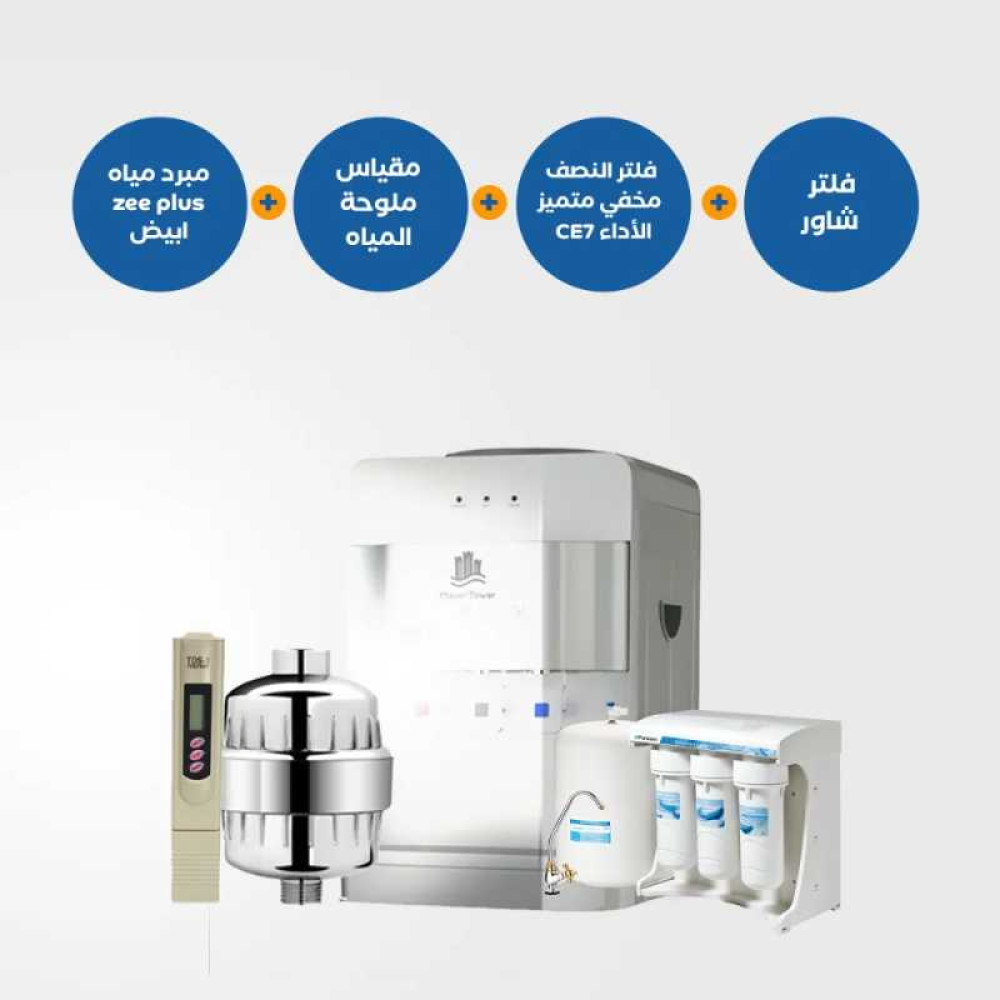 برادة المياه Zee plus بيضاء + فلتر النصف مخفي متميز الأداء CE7 + جهاز قياس الملوحة TDS meter + فلتر شاور