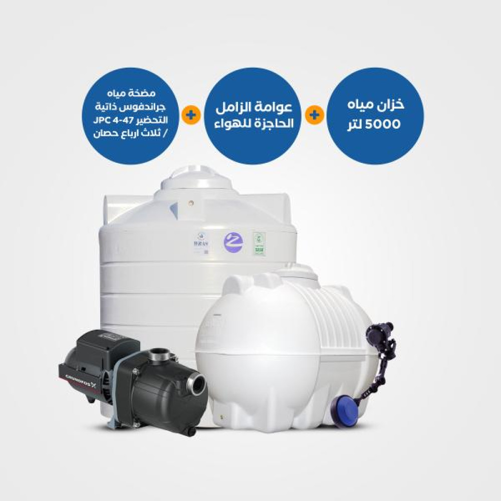بندل: خزان مياه 5000 لتر أفقي أو عامودي + مضخة جراندفوس JPC 4-47 ثلاث أرباع حصان + عوامة الزامل الحاجزة للهواء