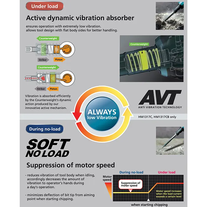 تقنية مقاومة الاهتزاز: تقنية مقاومة الاهتزاز هي نظام موازنة داخلي يقلل بشكل كبير من الاهتزاز بنسبة 70 ٪ ، ونحن نعلم من التجربة أنه كلما كانت أداة الطاقة أكبر ، كلما كان من الصعب التحكم فيها أثناء العمل. الآن ، بفضل نظام AVT من ماكيتا ، أصبح العمل بمطرقة أو مطرقة هدم أسهل بكثير ولا يتطلب مثل هذه اليد القوية من المستخدم.