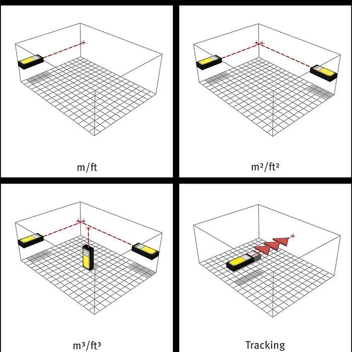 ليزر مضغوط وسهل الاستخدام مع 4 وظائف قياس أساسية: الطول والمساحة والحجم والقياس المستمر.