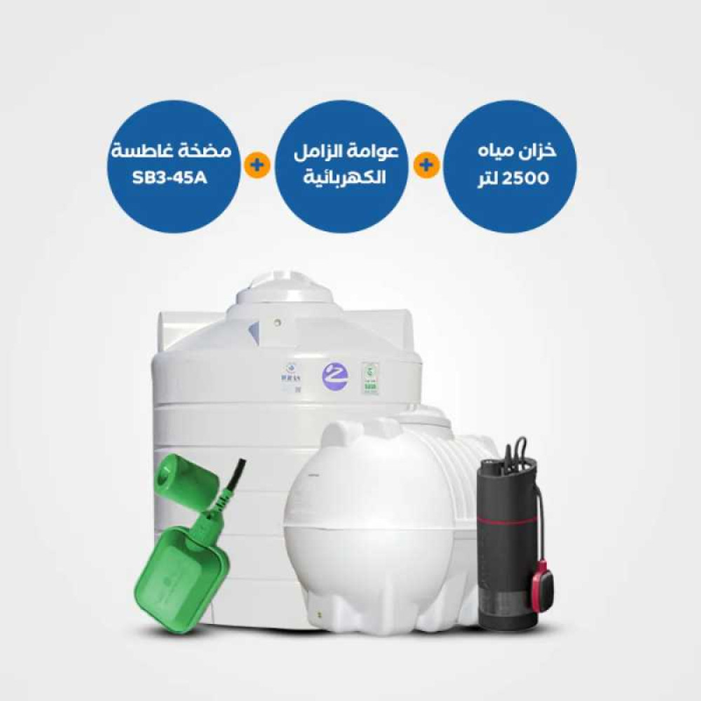 اجعل من نظام المياه لديك مثالاً في الكفاءة والتنظيم مع خزان الزامل 2500 لتر، مضخة SB 3-45A، والعوامة الكهربائية الذكية. الحل المثالي لمن يبحث عن الثقة في كل نقطة ماء.