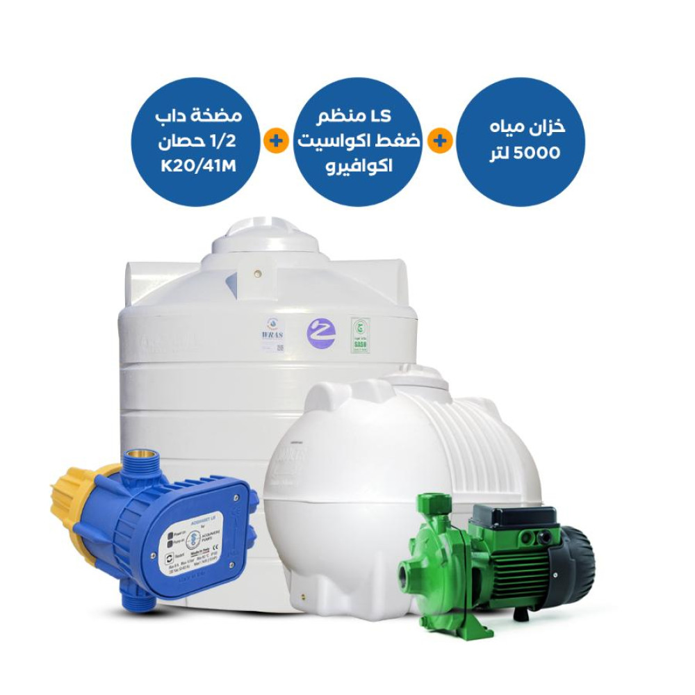 ارتقِ بمستوى الأمان المائي في منزلك مع نظامنا المتطور الذي يجمع بين سعة التخزين الوفيرة والتكنولوجيا الإيطالية المتقدمة. يتكون النظام من خزان سعة 5000 لتر بتصميم مرن قابل للتركيب أفقياً أو عامودياً حسب احتياجات المساحة، مدعوماً بمضخة داب الإيطالية الأصلية طراز K20/41M بقوة نصف حصان، ومنظم ضغط أكوافيرو أكواسيت LS الذكي لضمان تدفق مثالي للمياه في منزلك على مدار الساعة.