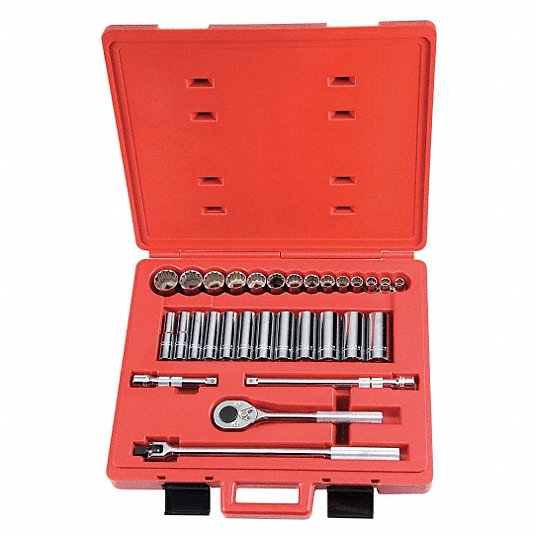 يأتي طقم مفتاح ربط SAE هذه مع أدوات تثبيت ومجموعة متنوعة من الحبات لمجموعة من أحجام التثبيت.
