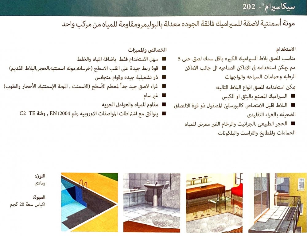 • مناسب للصق بلاط السيراميك الكبير للواجهات كما يستخدم في الأماكن الرطبة والحمامات والمسابح