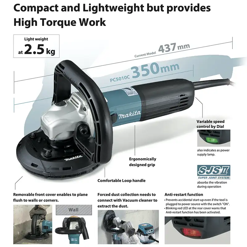ماكينة جلخ الخرسانة PC5010C ماكيتا مقاس مم125 مم، يعمل بمحرك 1400 واط الذي يوفر أداءً عاليًا مع 4000 ~ 9000 دورة في الدقيقة. يجمع بين القوة وسهولة الاستخدام والتحكم الفائق في الحجم الصغير. تم تصميم ماكينة جلي الخرسانة من أجل جلي الخرسانة ،وإزالة المواد الخرسانية الزائده، وإزالة طلاء السطح. بالإضافة إلى نظام جمع الغبار ، الذي يساعد على توفير بيئة عمل أنظف ، وبداية سلسة لبدء التشغيل بسلاسة ، و توفير عمر أطول للتروس ، كما يتيح ماكينة جلي الخرسانة التحكم في السرعة المتغيرة للمستخدم التحكم في السرعة والسرعة الثابتة للحفاظ على السرعة تحت الحمل.