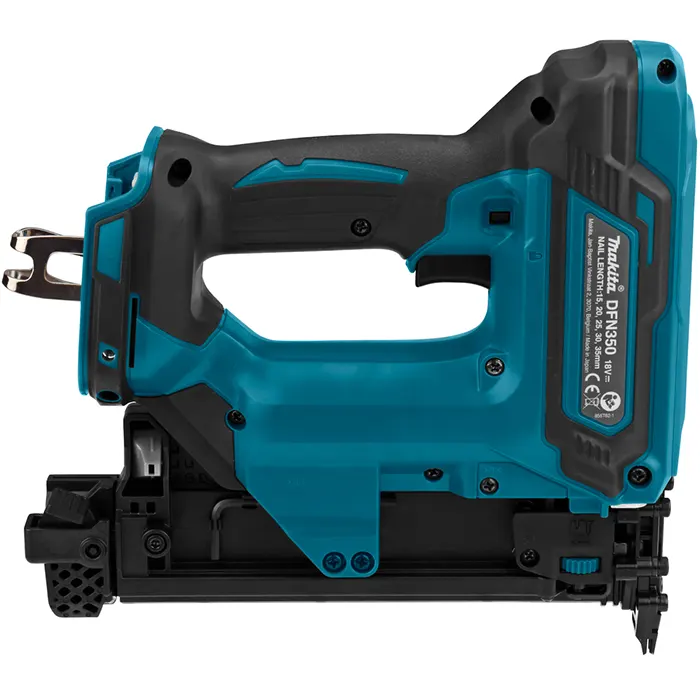 ماكينة تثبيت مسامير لاسلكي DFN350RTJ من ماكيتا، يعمل ببطارية ليثيوم أيون 18 فولت مع مسامير مقاس 18 جم 15-35 مم. يتميز بإمكانية تعديل العمق وآلية حريق مضادة للجفاف تمنع التشغيل بمجرد أن يصبح التخزين فارغ، كما أنه يحتوي على طرف تلامس مضاد للانزلاق يمسك بقطعة العمل بإحكام، وأنف رفيع بطرف ضيق لتسهيل الوصول إليه وتثبيته بزاوية. يتميز ماكينة تثبيت مسامير لاسلكي هذا بأنه خفيف الوزن ومريح عند الإمساك به وذلك بفضل قبضته المطاطية التي تقلل من الاهتزاز وإجهاد المستخدم. بالإضافة إلى ذلك، يحتوي على تقنية الحماية القصوى (XPT) التي توفر أقصى قدر من الحماية ضد الغبار والحطام والسوائل للحصول على الأداء الأمثل حتى في الظروف القاسية، ومصباح مدمج يضيء منطقة العمل لرؤية أفضل.