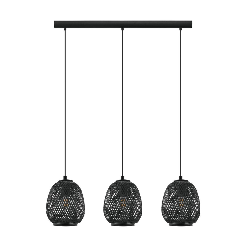 مصباح ديمبليبي المعلق الثلاثي من ايجلو يجمع بين التصميم العصري واللمسات الكلاسيكية. يتميز بهيكل معدني باللون الأسود مع ثلاثة مصابيح مغطاة بقش خشبي أسود، مما يخلق تأثيرات ضوء وظل جذابة على السقف والجدران.