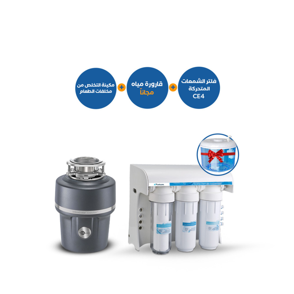 امنح مطبخك نقلة نوعية مع باقة متكاملة مصممة لتقديم أعلى مستويات النظافة والراحة. نقدم لك عرضاً استثنائياً يجمع بين مطحنة التخلص من مخلفات الطعام 100 عالية الأداء، وفلتر الشمعات المتحركة CE-4 الذي يضمن لك مياه نقية وآمنة، بالإضافة إلى قارورة مياه مجانية لتجربة متكاملة منذ اللحظة الأولى.