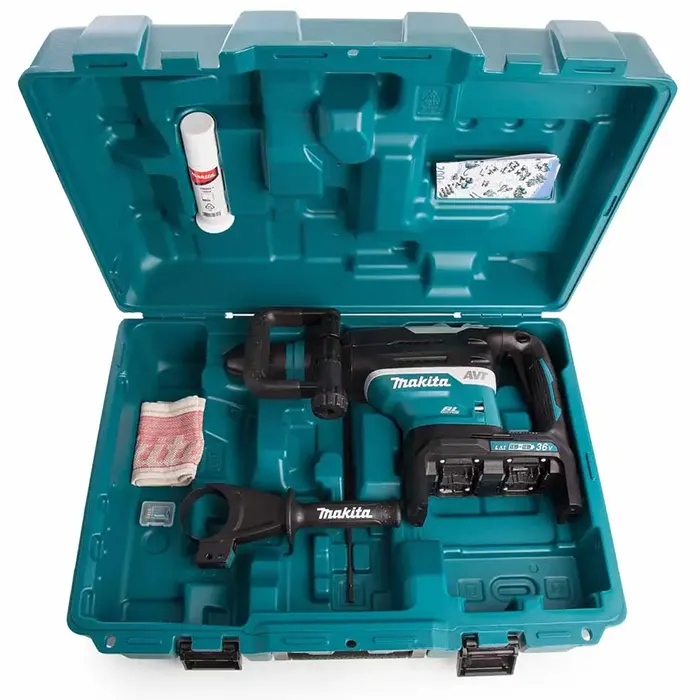 تقنية مقاومة الاهتزاز: تقنية مقاومة الاهتزاز هي نظام موازنة داخلي يقلل بشكل كبير من الاهتزاز بنسبة 70 ٪ ، ونحن نعلم من التجربة أنه كلما كانت أداة الطاقة أكبر ، كلما كان من الصعب التحكم فيها أثناء العمل. الآن ، بفضل نظام AVT من ماكيتا ، أصبح العمل بمطرقة أو مطرقة هدم أسهل بكثير ولا يتطلب مثل هذه اليد القوية من المستخدم.