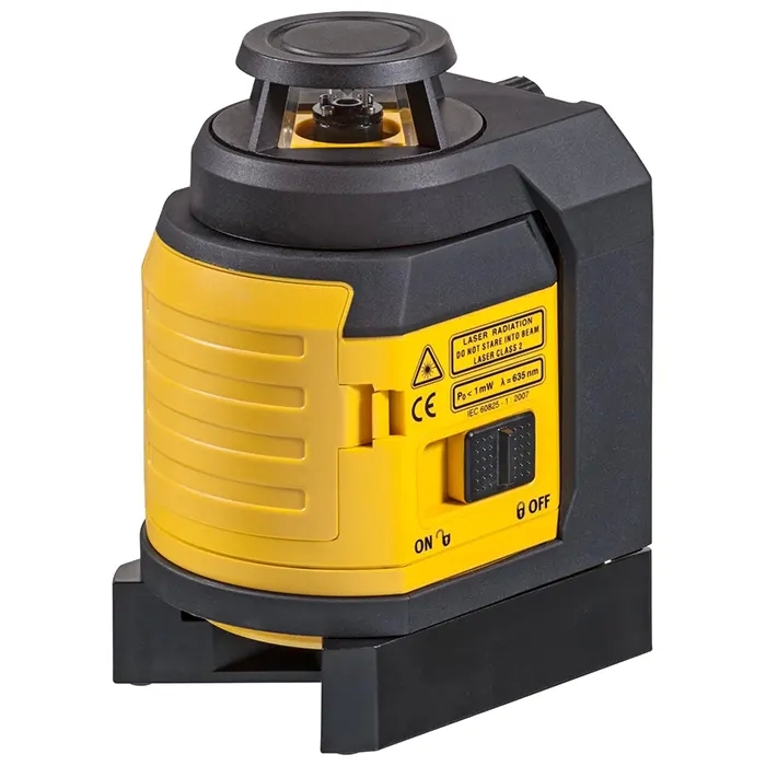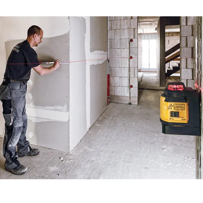 ليزر متعدد الخطوط ذاتي التسوية مع خط أفقي 360 درجة لنقل الأبعاد، وخطين عموديين بزاوية 90 درجة، وخط رأسي لأعلى ولأسفل لعمل تخطيط دقيق.
