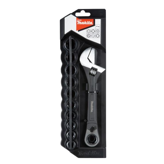 The Makita 11 Piece Pass Thru Adjustable Wrench Set contains 10 pass thru sockets in the following sizes & a 200mm pass thru adjustable wrench. The Pass Thru Sockets work on 6-point, 12-point, square, E-T, spline & partially rounded hex fasteners.