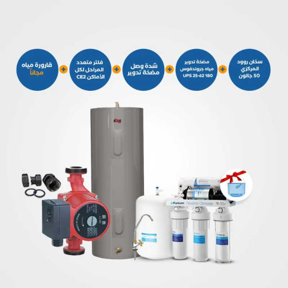 143-Ruud Water Heater 50 G + Grundfos Water circulator pump UPS 25-62 180 + Union+ Electrical Floater + Water Purifier -Water purifier CE2 – Puricom +RO water Bottle