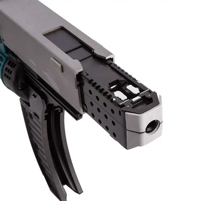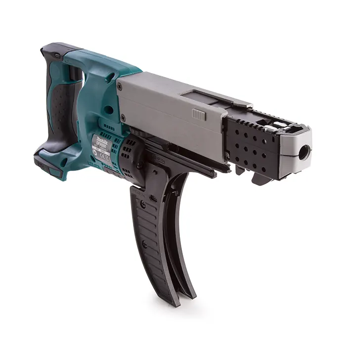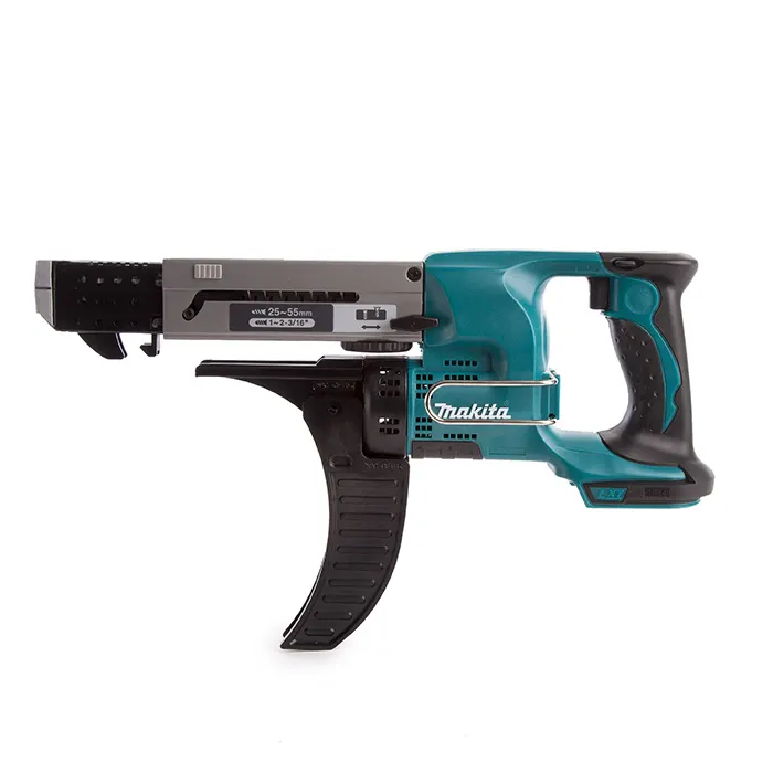 Makita DFR550Z Cordless Auto Feed Screwdriver, ideal for drywall applications, is powered by an 18V lithium-ion battery that provides 4,000 rpm. The Cordless Screwdriver has a compact and lightweight design, with an ergonomic soft rubber grip that absorbs vibrations and ensures comfortable operation. The forward/reverse switch is conveniently located for easy continuous operation. This Auto Feed Screwdriver speeds up the job of the continuous screwing, and with a flexible plastic strip, the process of fixing plasterboard sheets, screwing, and chipboard flooring or decking boards just got quicker. In addition to to reversing, to quickly remove screws and other fasteners.