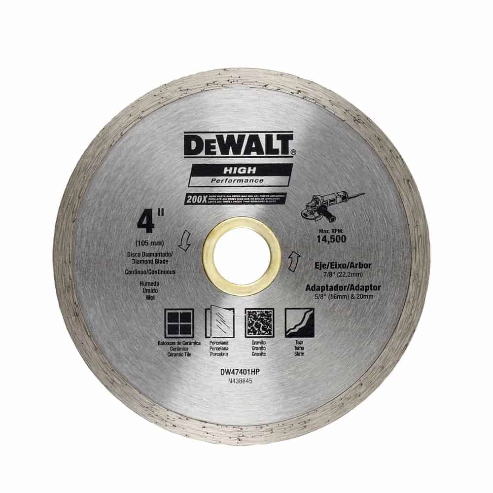 For the cleanest, chip-free cuts in delicate materials like ceramic tile, porcelain, marble, and granite, DeWalt’s Continuous Rim blades (e.g., DW47401HP, DW47901HP) are the ideal choice. Additionally, specialized Diamond Blades for Tile Cutting (e.g., DX3101, DX3121) provide optimized performance for precision work on various tile types.