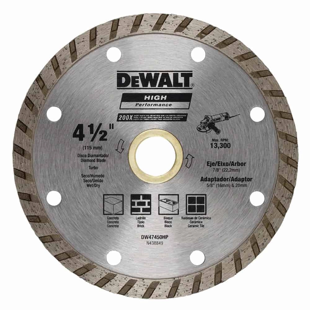 Turbo Rim blades (e.g., DW47400HP, DW47900HP) offer a versatile balance of speed and a smoother finish for general-purpose cutting in concrete, stone, and masonry.