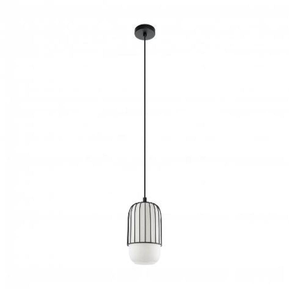 Eglo pendant light MULEGES with a distinctive cylindrical opal glass body and steel lattice shade. Adds elegance to tables while creating a beautiful light and shadow interplay.