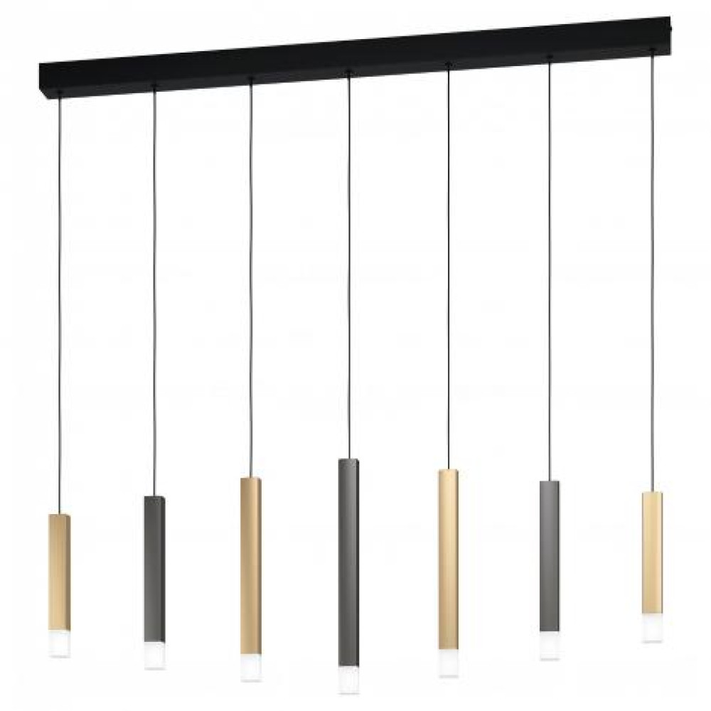 The EGLO ESTANTERIOS pendant light features a unique design with seven metal rods of varying lengths in gold, black, and brown, suspended from a black metal base. Each rod houses integrated LED lighting that emits warm white light, with adjustable brightness to suit different mood