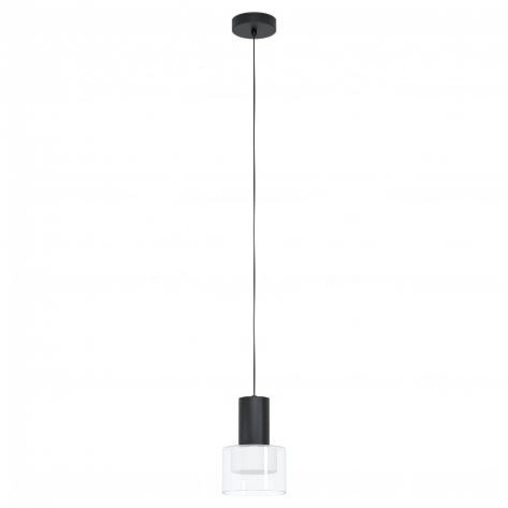 The Molineros Pendant by Eglo features a sleek black finish with an elegant double shade design, combining a clear outer glass shade with a white plastic inner shade. The fully adjustable black cable allows for flexible hanging height options.