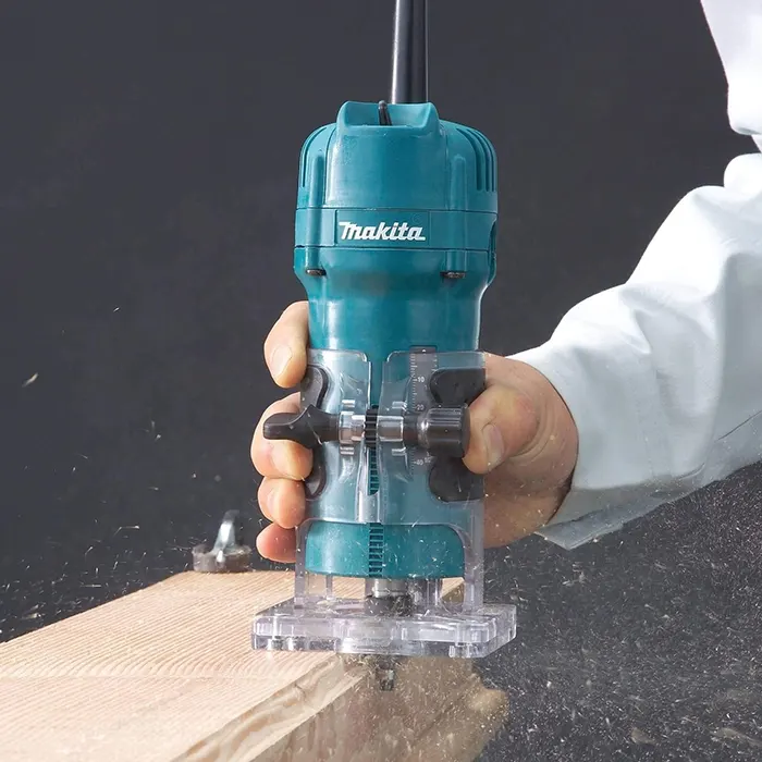 The Small Router For Woodworking Makita 3709 is a Trimmer 6mm powered by a 530W motor that provides 30,000rpm for smooth trimming and light routing applications, ensuring smooth operation. The rack-and-pinion depth adjustment feature allows for precise depth control, and the compact slim design makes it easy to handle. This Small Router For Woodworking is lightweight and has a rubberized grip that provides comfort during use. The toggle switch makes it easy to operate, while the all-ball bearing construction ensures durability and longer tool life. Additionally, the double insulation feature protects the user and electric motor components.