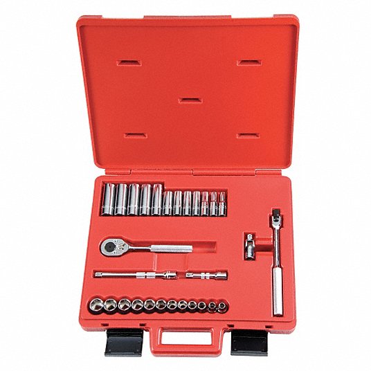 Metric socket sets come with drive tools and an assortment of sockets for a range of fastener sizes.