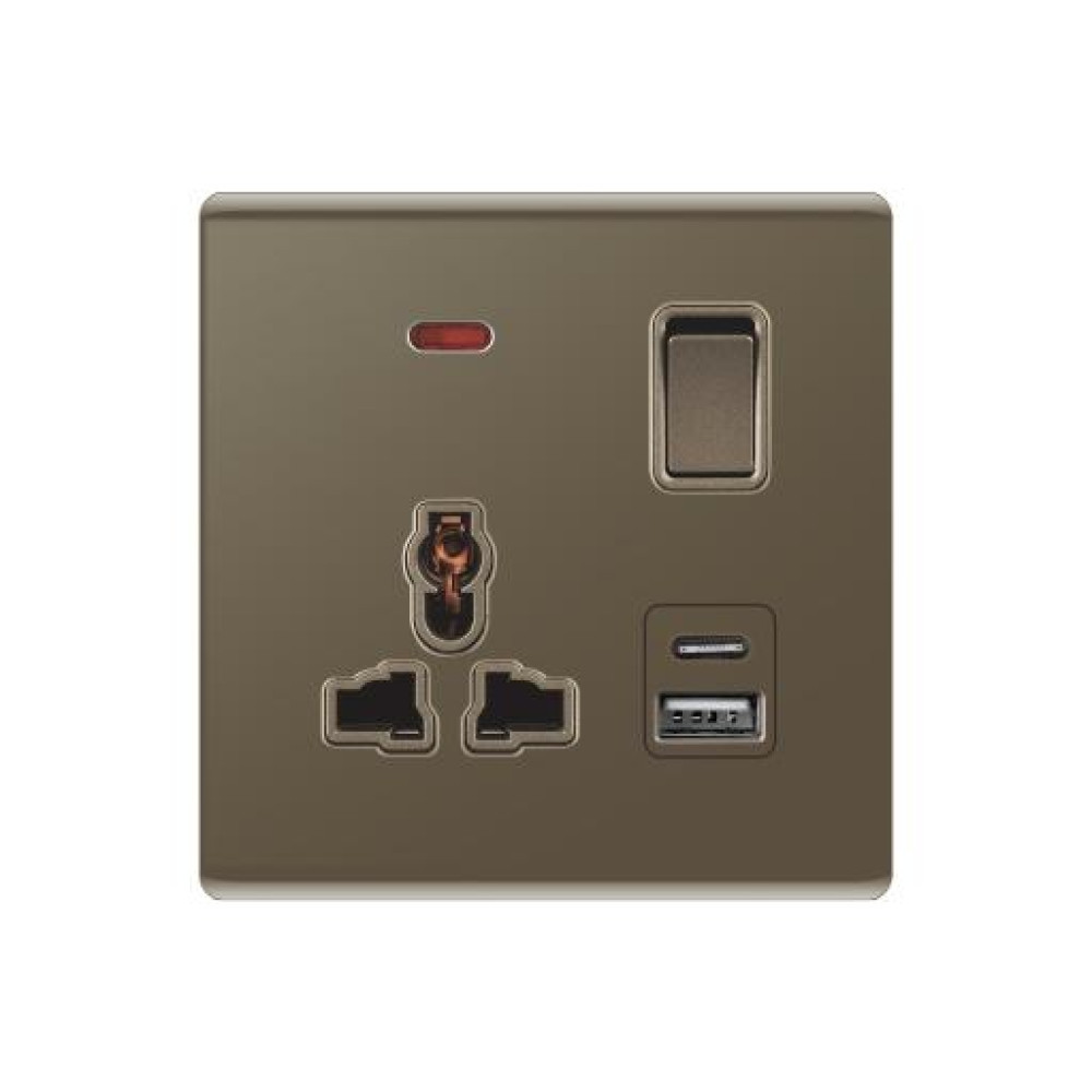 Zi 13*2A dual socket with switch and neon light, includes USB A and C ports, in a brown body. 32*88*86mm